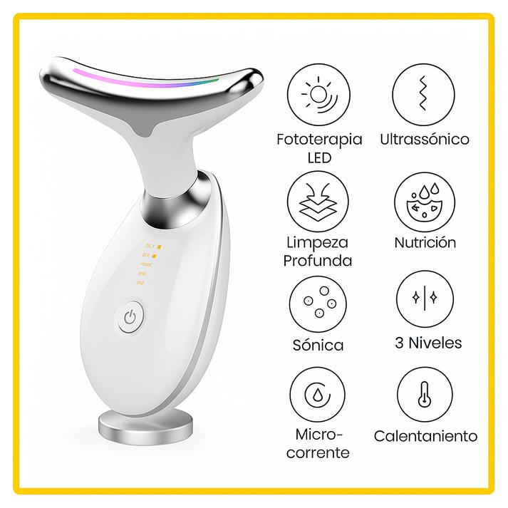 [12:17, 31/10/2025] Talles Oliveira: Está diseñado para cuidar tu piel con tecnología de última generación. Su diseño ergonómico y su cabezal en forma de “Y” se adapta perfectamente al contorno del cuello y el rostro, permitiendo una aplicación cómoda y efectiva en cada uso. Es tu aliado perfecto para combatir la flacidez, las arrugas y mejorar la textura de la piel desde la primera semana. [12:17, 31/10/2025] Talles Oliveira: Este dispositivo combina fototerapia LED, vibración de alta frecuencia y termoterapia inteligente para ofrecer un tratamiento integral. La luz roja ayuda a mejorar la elasticidad de la piel, la luz azul calma y purifica, mientras que la luz verde unifica el tono facial. Además, su sistema de calor constante a 45 °C estimula la circulación y potencia la absorción de cremas o sérums.